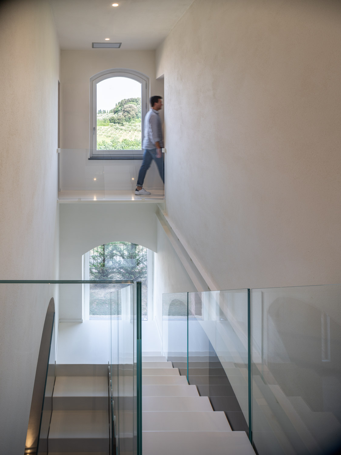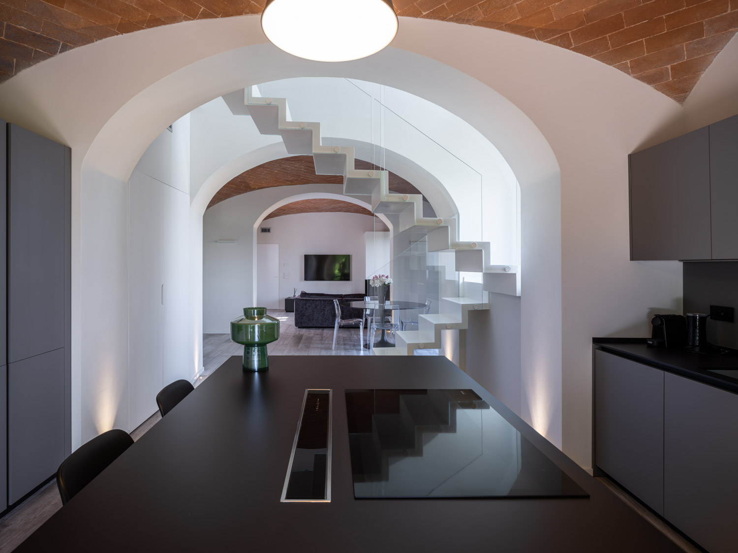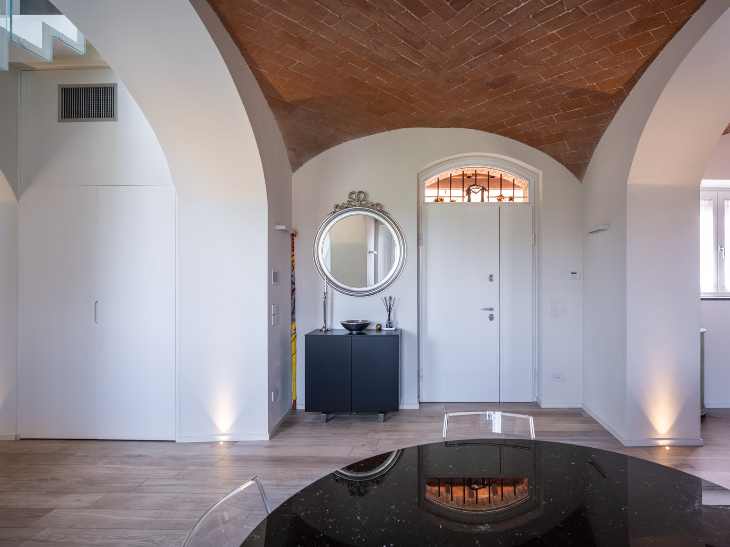 Luce, archi e trasparenze dialogano in equilibrio, restituendo un ambiente dove il contemporaneo non contrasta il passato, ma lo accompagna con rispetto e coerenza progettuale.