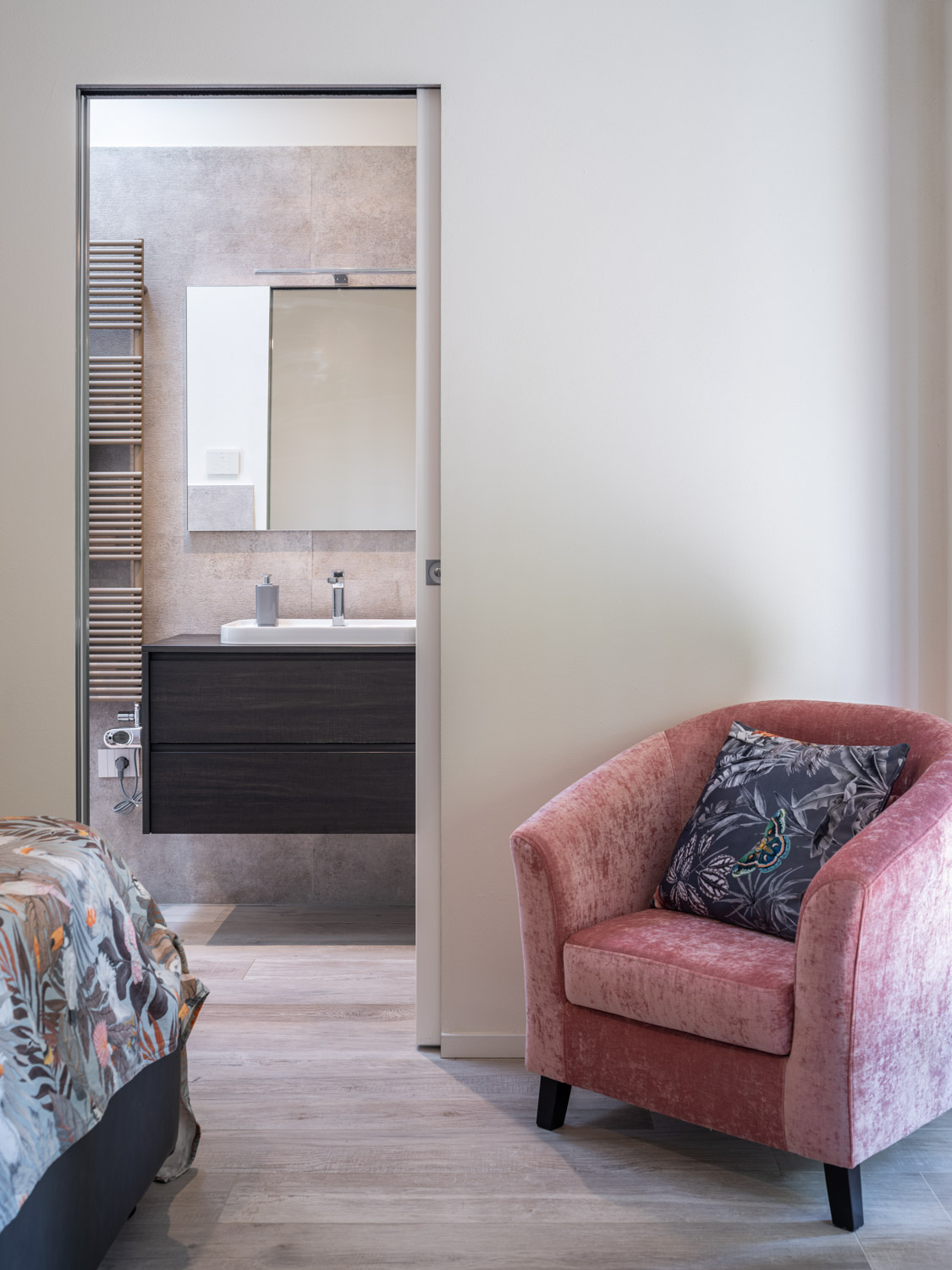 Il nome Linea d’Aria evoca proprio questo: un segno leggero che attraversa lo spazio, suggerendo leggerezza visiva, libertà compositiva e armonia sensoriale. Lo spazio rinnovato è pensato per liberare il pensiero, accompagnare i gesti quotidiani e restituire una dimensione abitativa intima, silenziosa, ma intensamente materica.